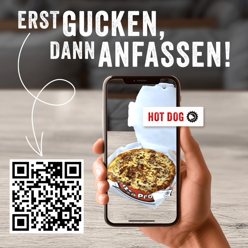 So hast du deine Pizza noch nie gesehenErlebe die Pizza HOT DOG in 3D, bevor du bestellst. Überlege, wo du deine Pizza genießen wirst und lass Traum und Wirklichkeit miteinander verschmelzen. Einfach QR-Code scannen, Pizza live erleben und Appetit holen. -
